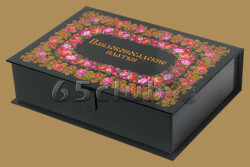 Коробка стилизована под лаковую шкатулку. На крышке - красивый цветочный орнамент на тёмном фоне надпись: ПАВЛОВОПОСАДСКИЕ ПЛАТКИ Крышка застегивается на застежку — липучку. Дно и стенки коробки изнутри оклеены матовой черной бумагой. В коробку поместится платок или шаль размером до 148 на 148 см Размер коробки 250 на 175 на 63 мм Производитель Россия