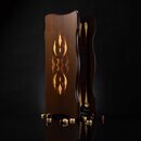 Авторские нарды премиум класса из массива венге Размер доски в сложенном виде 30 на 60 см Размер доски в разложенном виде 60 на 60 см Материал нард: корпус - венге, шелковисто - матовый лак, рисунок в технике маркетри (мозаика) Лицевая сторона - венге, орех, падук, лимонное дерево, красное дерево. Игровое поле внутри - венге, падук, лимонное дерево. Замки - потайные магниты. Венге - редкая и ценная порода тропической древесины, получаемая из дерева Венге произрастающего в Центральной Африке. Древесина венге – одна из самых лучших и дорогих, и не только благодаря своему изысканному цвету и «грубоватой» текстуре, а также из-за физических свойств. Она устойчива к удару, давлению и изгибу. Эти нарды отличаются эргономичной формой доски, удобными криволинейными краями и плавными изгибами фигурной кромки. Отсутствие видимой замочной фурнитуры придает игровому комплекту лаконичный и законченный внешний вид. Рисунок, на лицевой и внутренней сторонах комплекта, набран вручную из шпона ценных пород дерева по технологии маркетри, что в свою очередь обеспечивает эксклюзивность исполнения. В комплекте фишки диаметром 30 мм Материал фишек: светлые - колхидский самшит, темные - красное дерево, все фишки подклеены замшей, чтобы не царапать доску. Кубики - из обсидиана (камня, который ещё называют «вулканическое стекло») Вес нард - 4,1 кг Производитель Россия, Мастерская Кадуна Сертификат об изделии с подписью автора в комплекте!